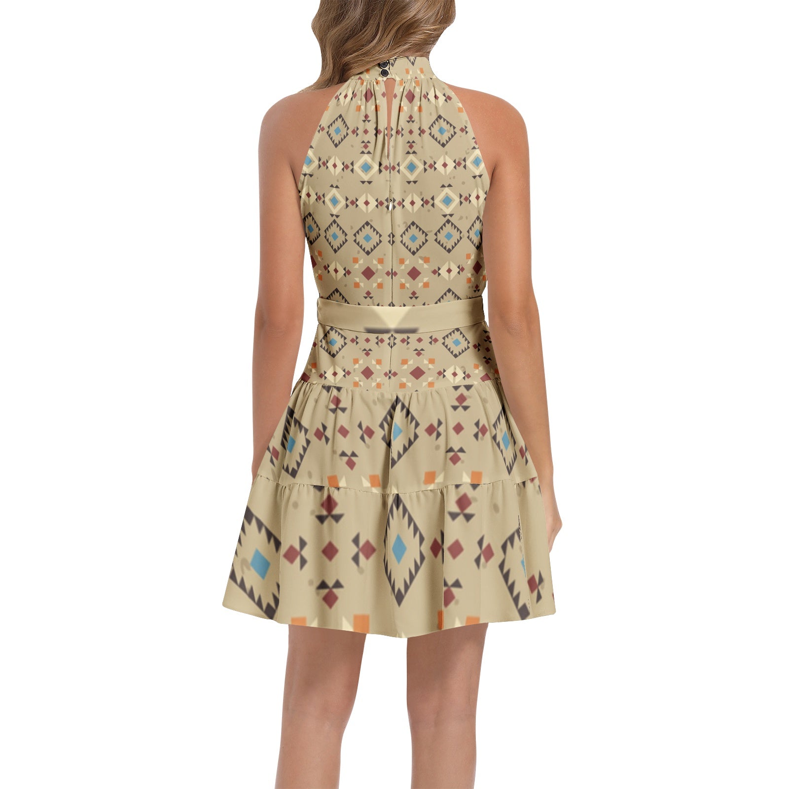Sleeveless, Halter neck, Back hidden zipper, Belt tie waist, Flared hem, Short dress