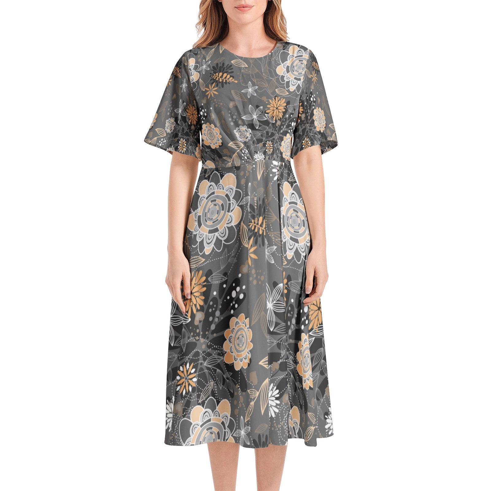 Short Sleeve, Boat Neck, Back hidden zipper, High waist, Flared hem, Midi dress